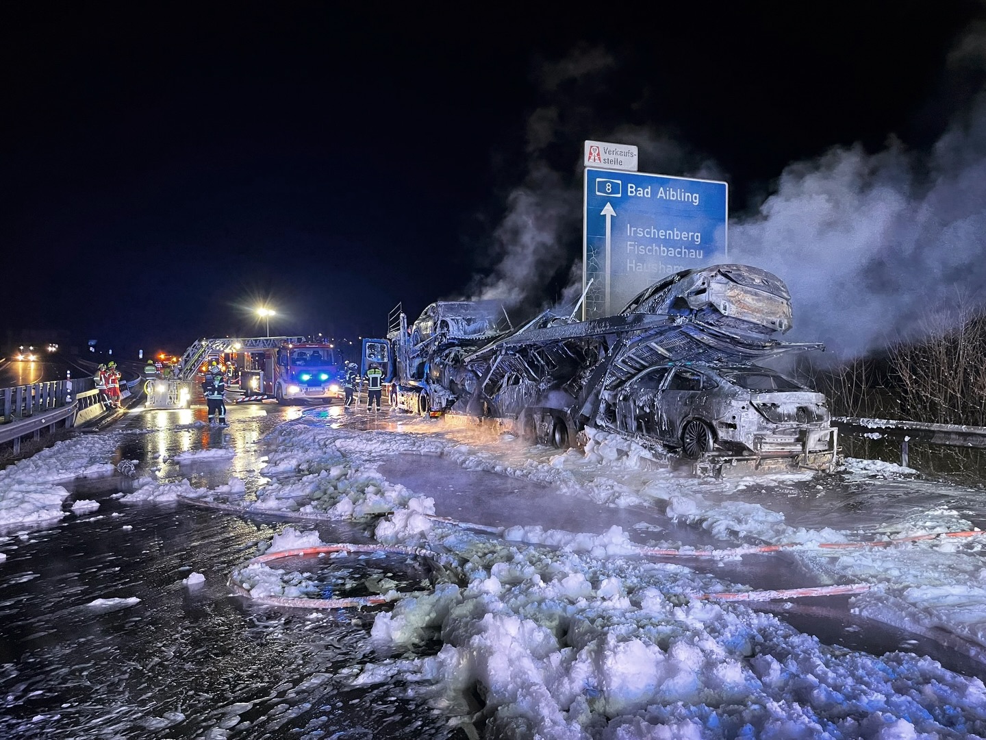 Am 13. Dezember 2025 brannte kurz vor Autobahnabfahrt Irschenberg in Richtung Salzburg ein Autotransporter. Zusammen mit weiteren Feuerwehren waren wir in den Morgenstunden im Einsatz.