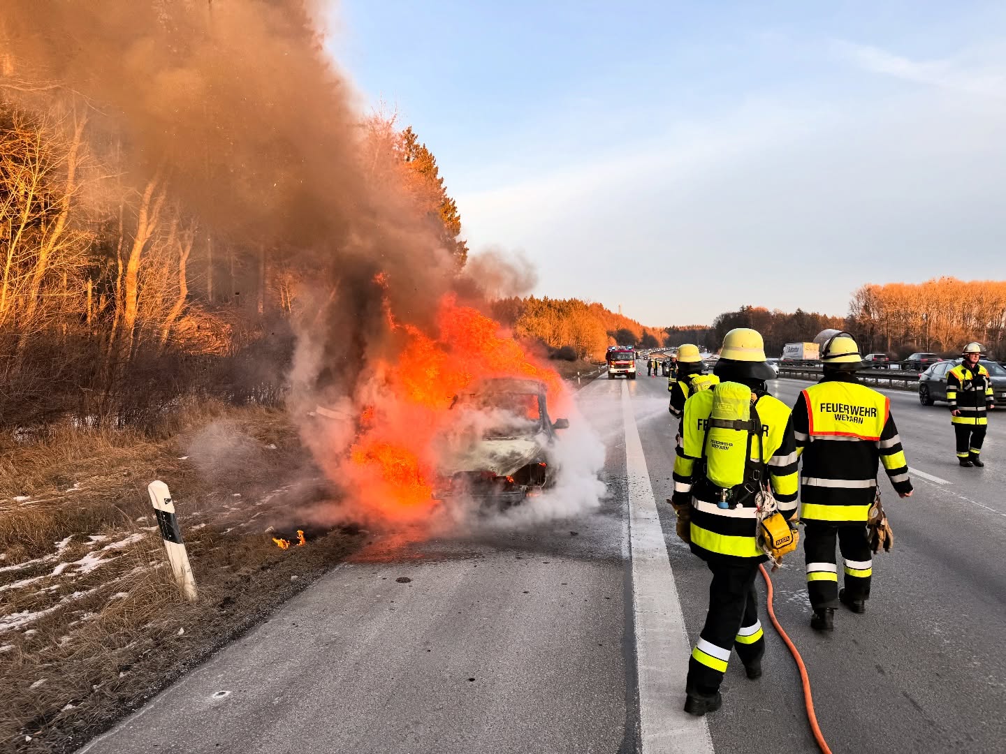 Nächtlicher Alarm auf den Sonntag, Alarmzeit 3:04 Uhr. Beim Ausrücken auf die Autobahn A8 in Richtung München rüstete sich bereits ein Atemschutztrupp auf Anfahrt aus. Gemeldet war laut Leitstelle ein brennendes Fahrzeug im Auffahrbereich Holzkirchen.