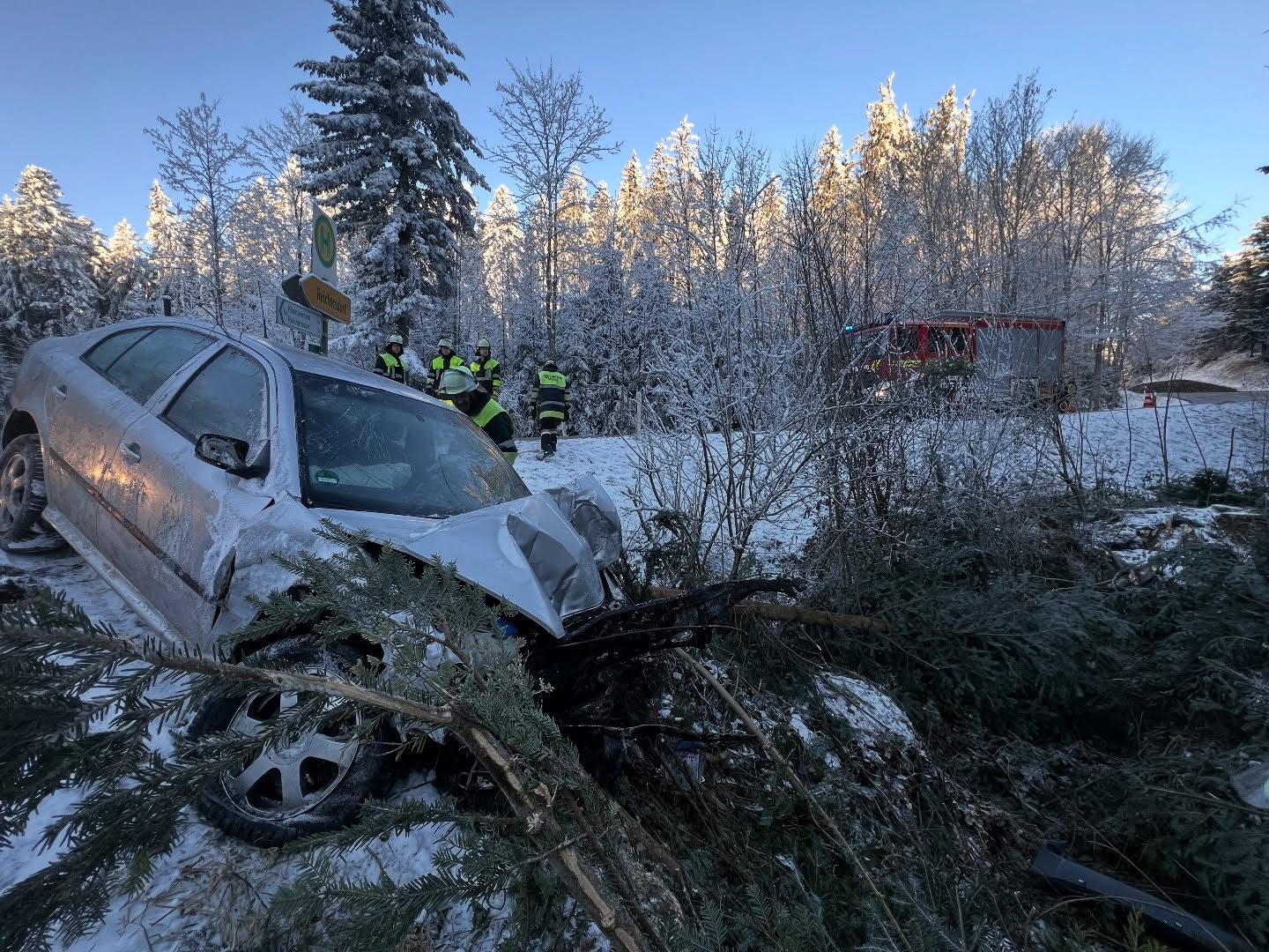 Eine dritte Person war noch im Fahrzeug eingeklemmt und wurde mit Hilfe von Spreizer und Schneidgerät durch die ebenfalls alarmierte Feuerwehr Miesbach befreit und anschließend vom Rettungsdienst ins Krankenhaus gebracht.