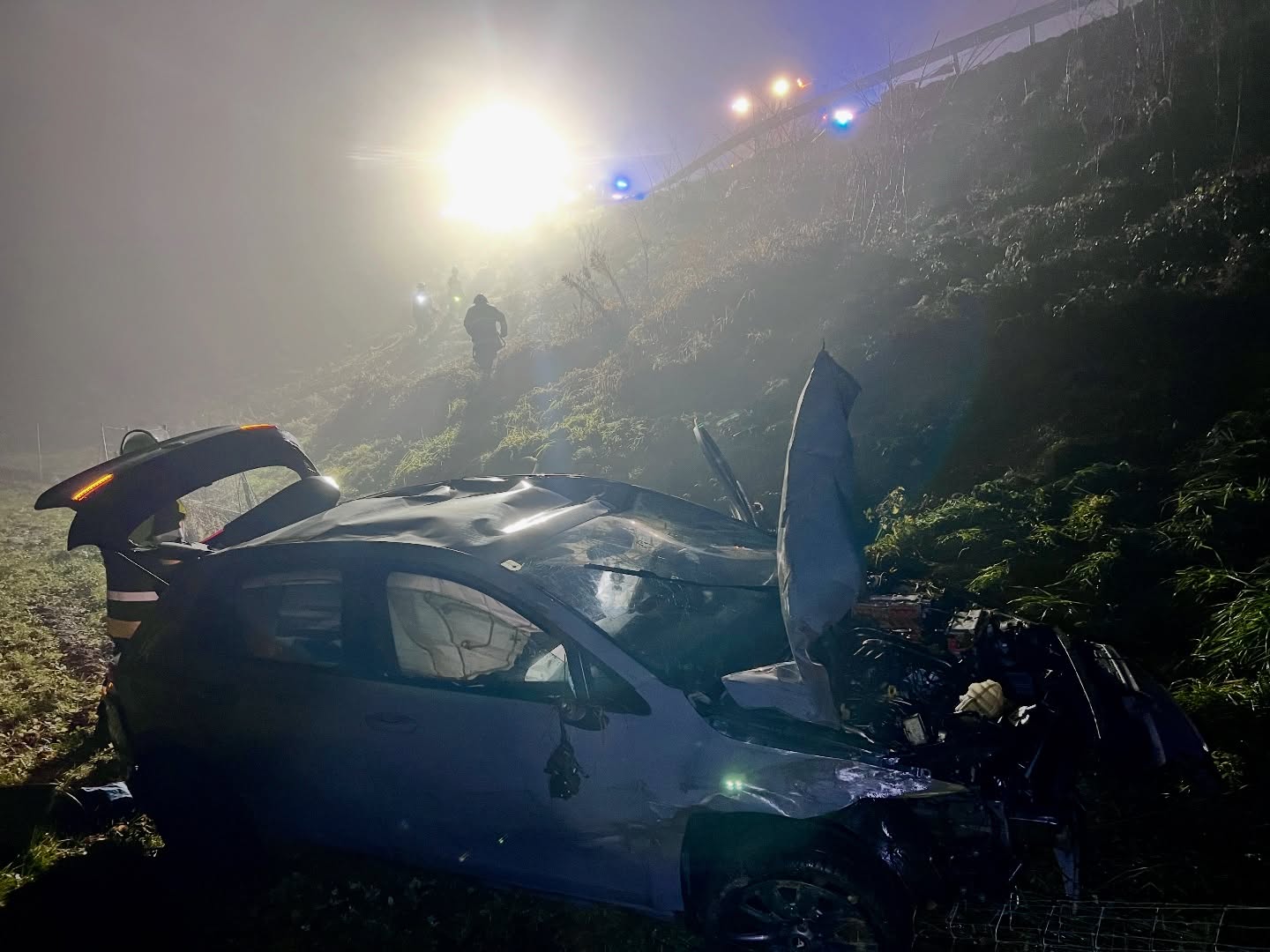 Vor Ort stellte sich folgende Lage dar: Ein PKW war alleinbeteiligt auf der Auffahrt Holzkirchen von der Brücke kommend durch die Leitplanke gebrochen und den steilen Abhang hinuntergestürzt.