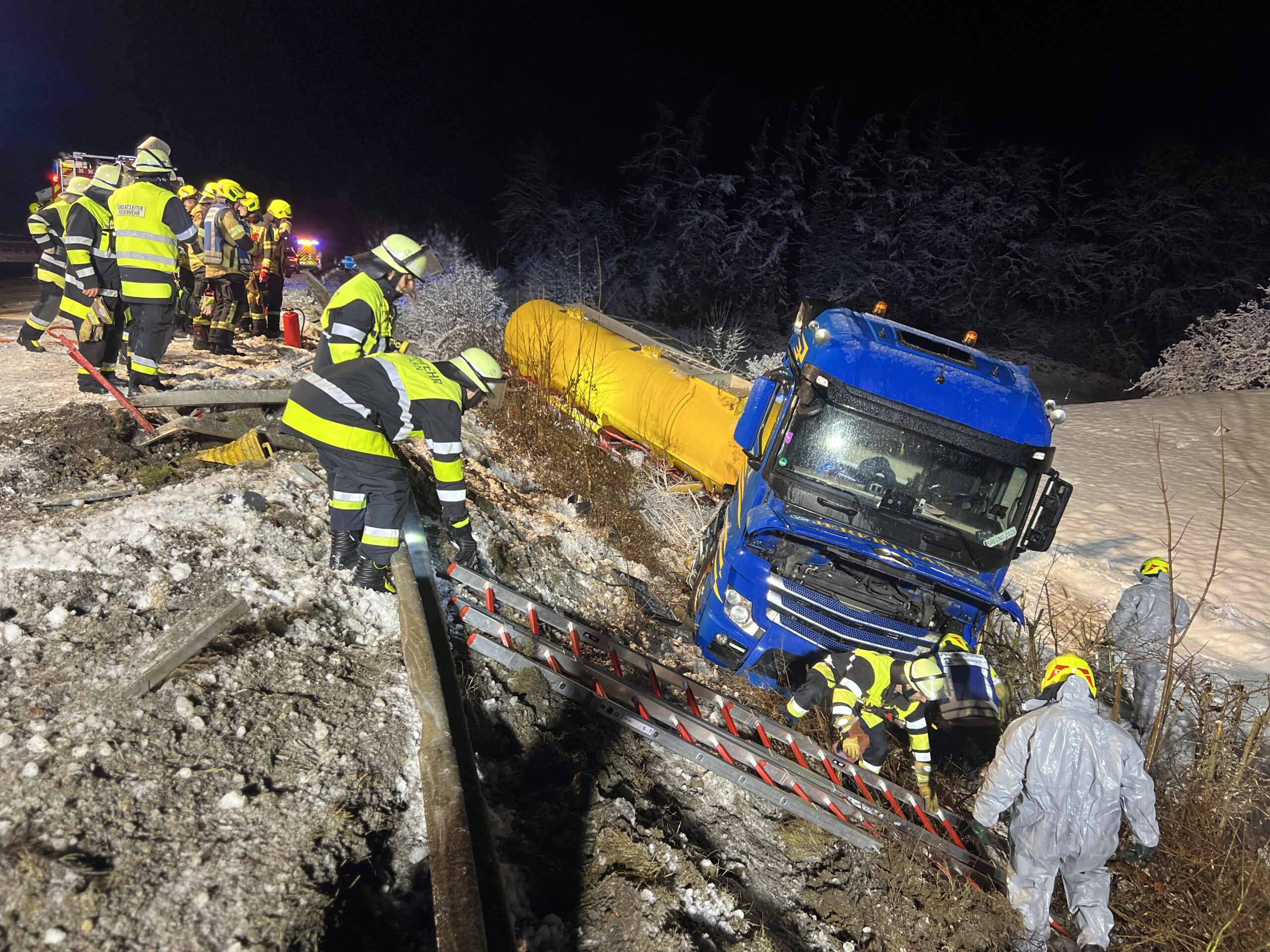 Wir sicherten die Unfallstelle, verhinderten das Austreten von Betriebsstoffen und Calciumcarbonat und dichteten zusammen mit der Feuerwehr Irschenberg den aufgerissenen Tank ab, sodass keine weiteren Stoffe austreten konnten. Eine Gefahr für die Umwelt bestand durch das üblicherweise in der Papierindustrie eingesetzte Calciumcarbonat nicht.